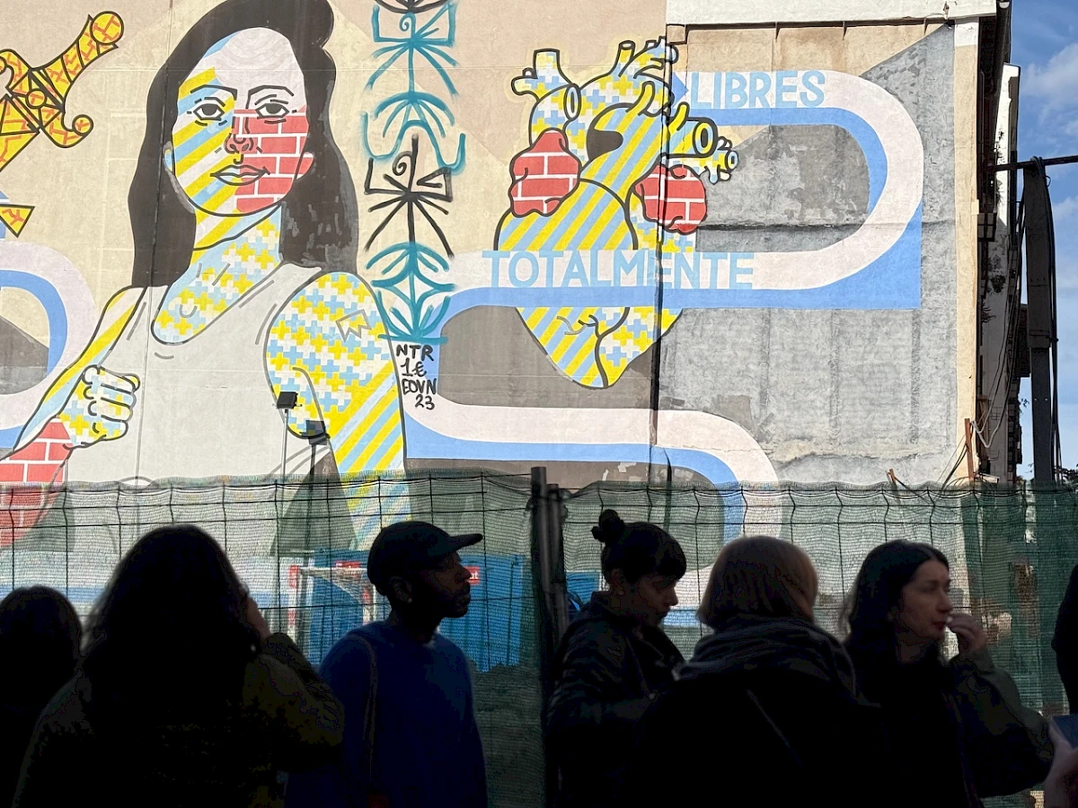 A monumental mural rises above a temporary fence. Painted bodies are enlarged, fragmented, patterned – faces crossed with stripes, torsos tiled like architecture, a heart lifted outside the body, exposed and held. Words curve across the wall: LIBRES, TOTALMENTE. Freedom appears as declaration, not condition.