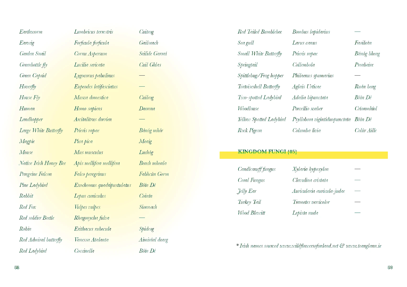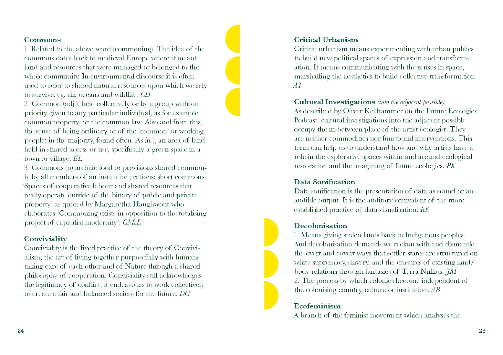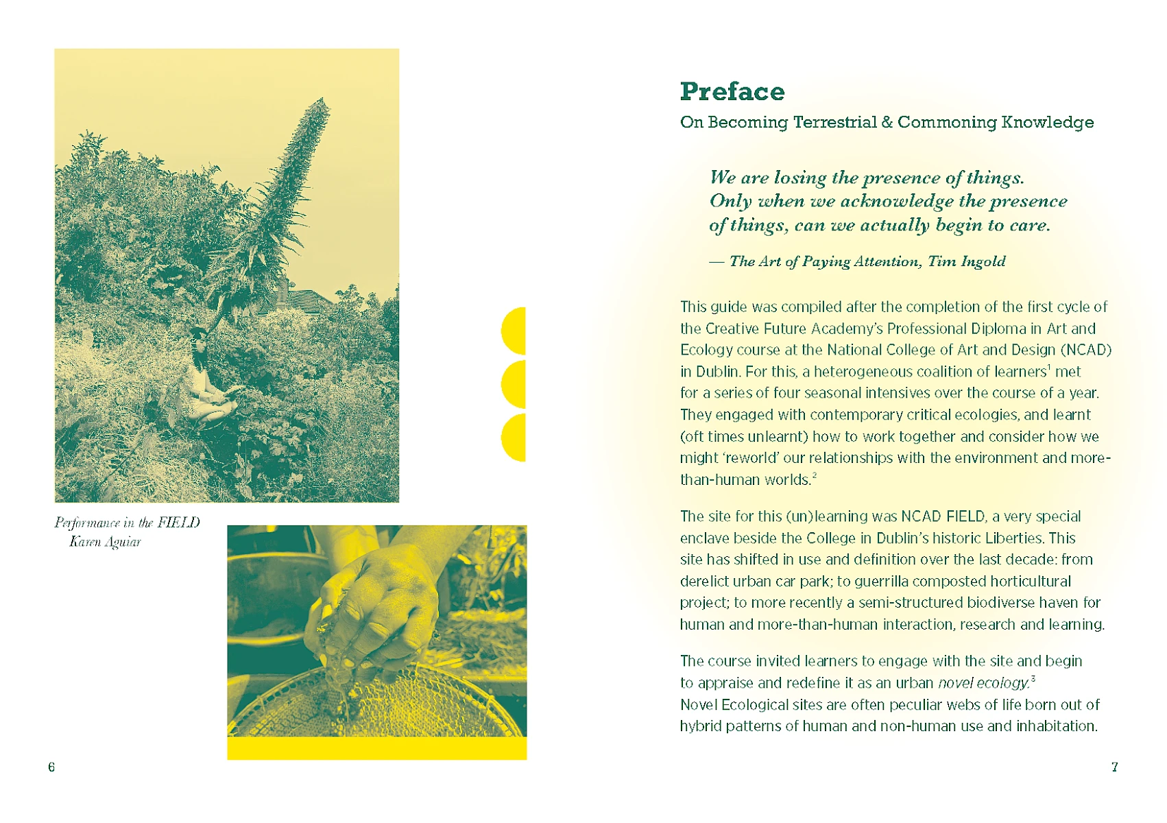 FIELD Guide – A Terrestrial Lexicon & Multispecies Index was compiled after the completion of the first cycle of the Creative Future Academy’s Professional Diploma in Art and Ecology course at the National College of Art and Design (NCAD) in Dublin. A heterogeneous coalition of learners met for a series of four seasonal intensives over the course of a year. They engaged with contemporary critical ecologies, and learnt (oft times unlearnt) how to work together and consider how we might ‘reworld’ our relationships with the environment and more- than-human worlds.