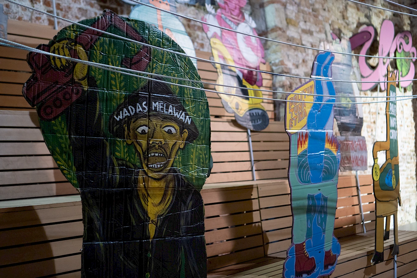 Alongside the props made for the No Cruise Ships action in the Lagoon and for a climate justice march in Milan, the exhibition features two films by Oliver Ressler (one documenting the 2019 Venice Climate Camp, the other reflecting on the occupation of the Hambach forest), and a series of banners, paintings, and prints by Taring Padi.