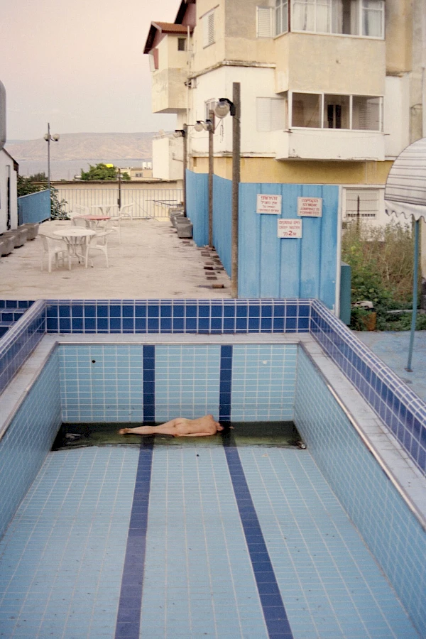 In these, what I think of as Greetings… ’ contractions, Joanna created a series of situations where she lies face down on the ground: across a sidewalk in long sleeves and long skirt in the Haredi neighborhood of Mea Shearim, and naked against the bottom of an empty private swimming pool in Tiberias. The latter was photographed and titled State of Israel. I see her forehead rested on the blue tiles, face submerged in the bit of green water, her free ears listening for what hovers, eyes staring into the ground where the beast is buried because the ground is where everything is buried, like five hundred Palestinian villages. My friend Dirar Kalash, a sound artist and musician from Kafr Qari, who like Joanna is both completely deaf in one ear and was definitively politicized in the Second Intifada, tells me that to listen in a destroyed, colonized village one must refuse to hear with one’s ears.33