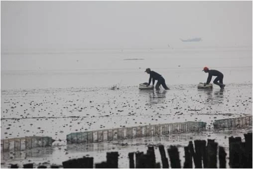 This photo is from the 70s of Deep Bay, the fishing village, Lau Fau Shan, whose livelihood depends on oyster aquaculture. Villagers used to collect oysters from the bodies of mangroves, otherwise using stakes or lattice trays of bamboo. Oysters were cleaned on the shore, villagers then made building material from oyster shells, mixing it with glutenous rice, and egg white. Historians point to similar techniques that had been used in the City Walls of Nanjing, and the Tiger Hill Pagoda in Suzhou, centuries ago.