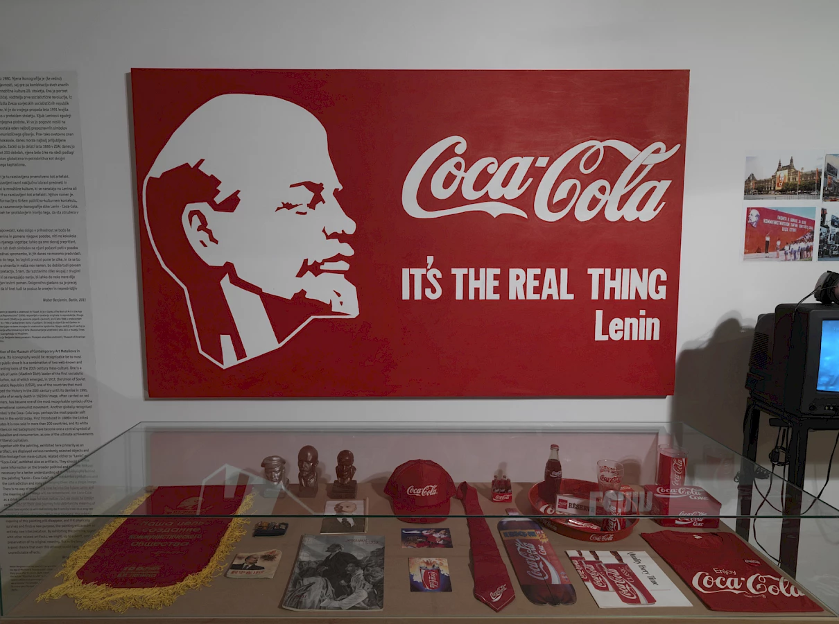 Here is a work of art in the form of a painting by Alexander Kosolapov entitled Lenin – Coca-Cola, dated 1980, in the collection of the Museum of Contemporary Art Metelkova in Ljubljana. Its iconography would be recognisable to most of the public since it is a combination of two well-known and contrasting icons of twentieth century mass-culture. One is a portrait of Lenin (Vladimir Ilich), leader of the first socialist revolution out of which emerged, in 1917, the Union of Soviet Socialist Republics (USSR), one of the countries that most shaped the history of the twentieth century until its demise in 1991. In spite of an early death in 1923, his image, often carried on red banners, has become one of the most recognisable symbols of the international communist movement. Another globally recognised symbol is the Coca-Cola logo, perhaps the most popular soft drink in the world today. First introduced in 1886 in the United States, it is now sold in more than 200 countries and its white letters on a red background have become a central symbol of globalism and consumerism, as one of the ultimate achievements of liberal capitalism. Exhibited here primarily as an artefact, the painting is displayed with various randomly selected objects and film footage from mass culture, related either to "Lenin" or to "Coca-Cola", which are also exhibited as artefacts. They should provide some information on the broader political and cultural context necessary for a better understanding of the iconography behind the painting, the respective symbolisms and the contradiction and irony of merging them into a single image. There is no way of predicting how far into the future Lenin and the meanings of his image will be remembered, nor Coca-Cola as a drink and its logo for that matter; but we could be almost certain that on their slow journey into oblivion the meaning of these two symbols will definitely be transformed in a way we could not anticipate today. When that happens, the original meaning of this painting will disappear, and if it physically survives and finds a new purpose, the painting will acquire an entirely new interpretation. By exhibiting the painting together with other related artefacts, we might, up to a point, prolong the preservation of its original meaning. But in the long run, there is a good chance that even this attempt would have only limited and unpredictable effects.