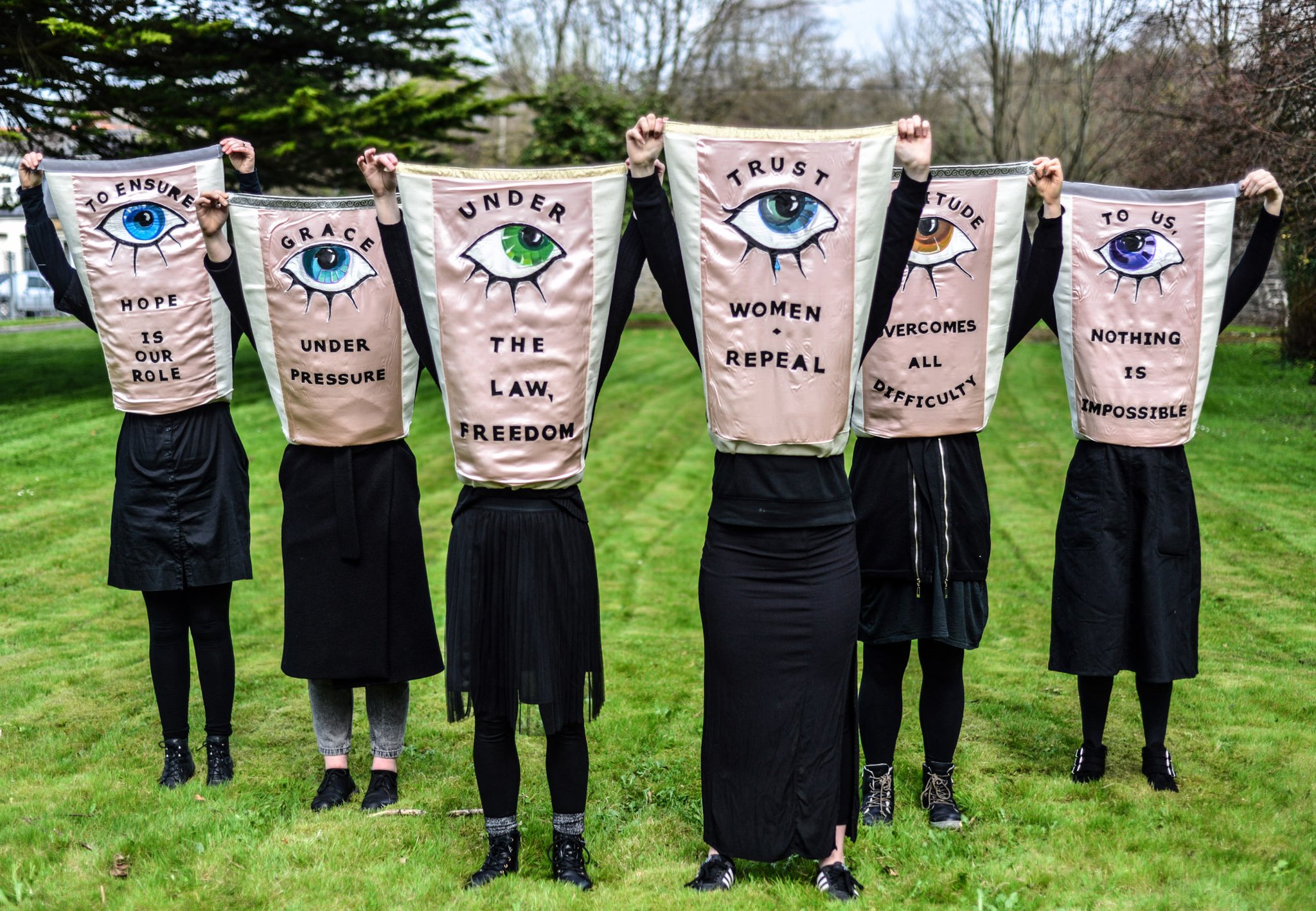 Rachel Fallon, Aprons of Power, 2018. Apron wearers: Lynn-Marie Dennehy, Emma Finucane, Eleanor Phillips, Kim Gleeson, Nuala Clarke, and Nicole Flanagan. Performance as part of the Artists’ Campaign to Repeal the Eighth Amendment, shown at EVA International 2018. Photo/courtesy: Darren Ryan.
