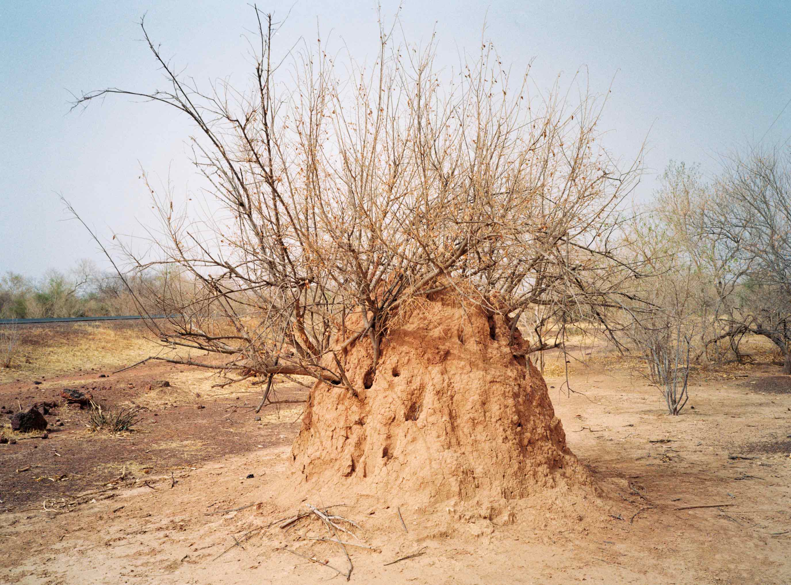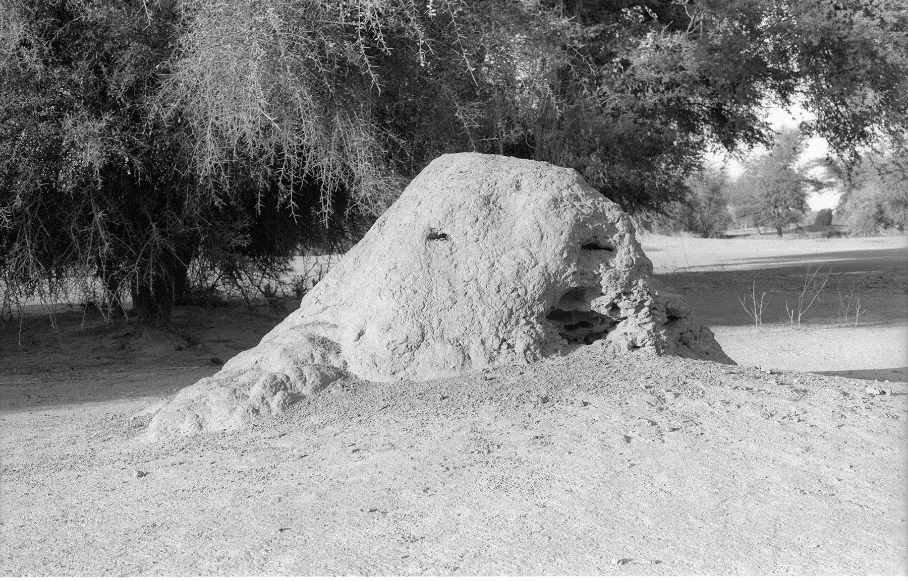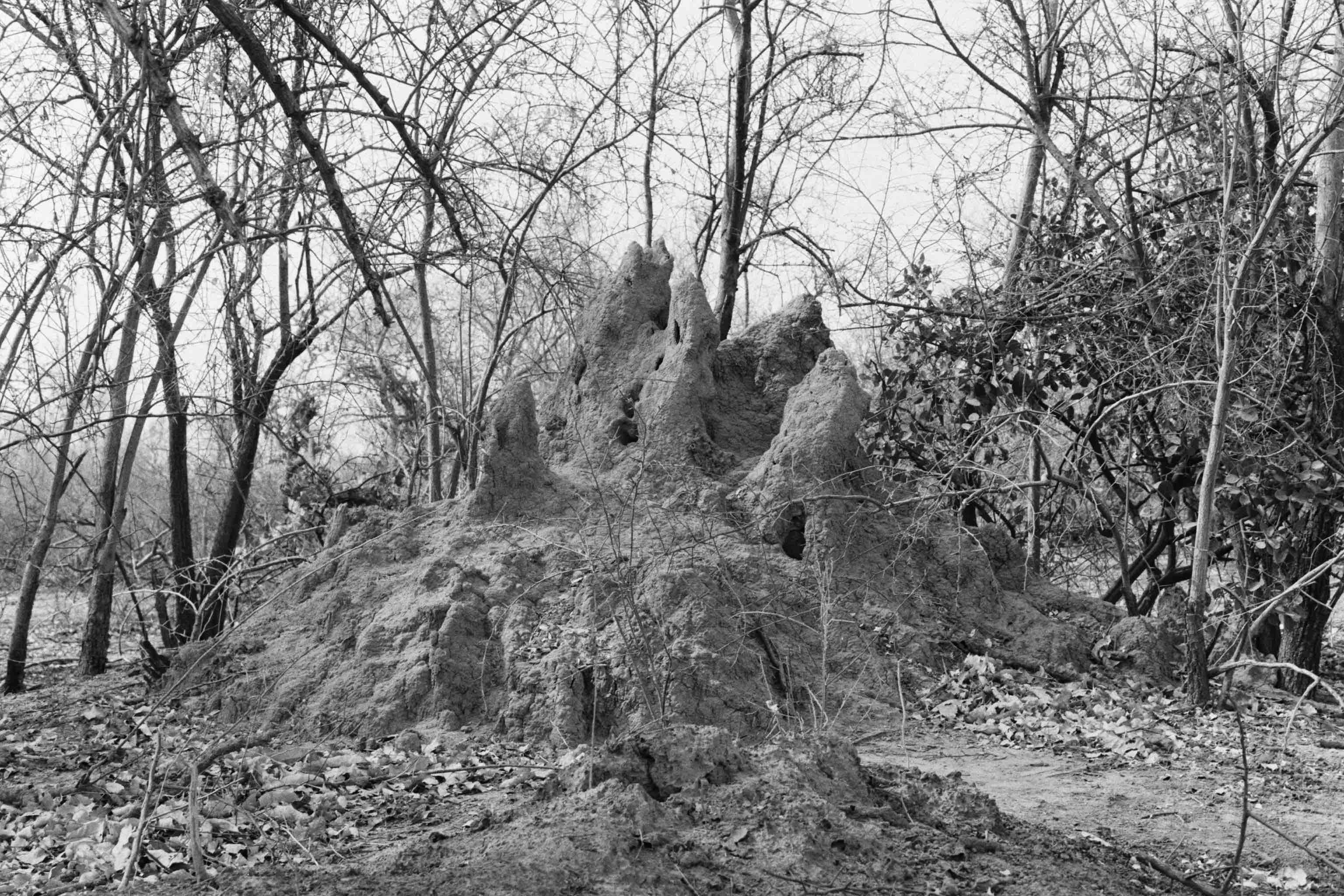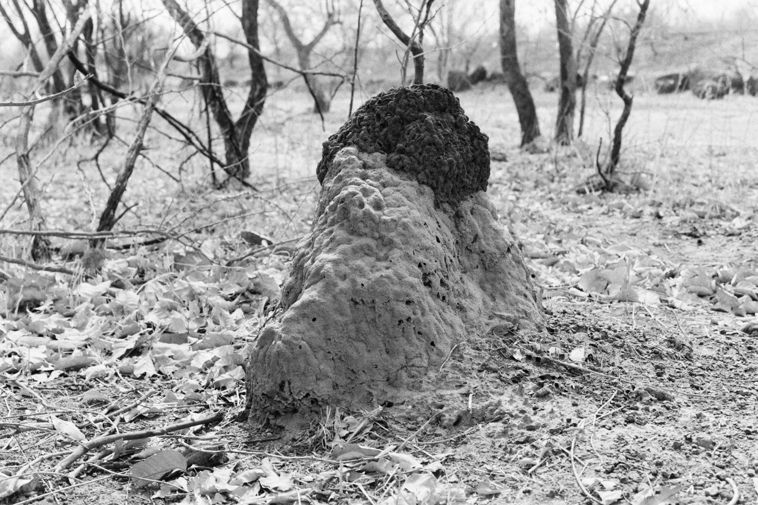 Since that first meeting, I have returned regularly to this particular mound and the surrounding area, taking photographs with an analogue camera. The process of analogue photography delays the moment of seeing the image. Once I see it, I am closer to the moment I took the picture, but also elsewhere, in another time. Analogue photography disrupts linear, temporal experience by making past moments visible. The photograph, as light etched on film, reconfigures presence and absence, duration and fugitivity. Brief moments spent in places can be represented by images – photographs – that crystallize those moments forever. Or, the long time we spend in places can be condensed into a single shot taken in fragments of a second. A still image is only a detail of what is felt, sensed and seen. It is inherently incomplete and fragmentary. The mounds are fixed, static formations that change over time, but these changes might not be visible to the camera, even over the course of weeks or months. This peculiarity of termite mounds, their apparent stability and internal dynamism, makes them generative, if perhaps counter-intuitive, subjects for photography.