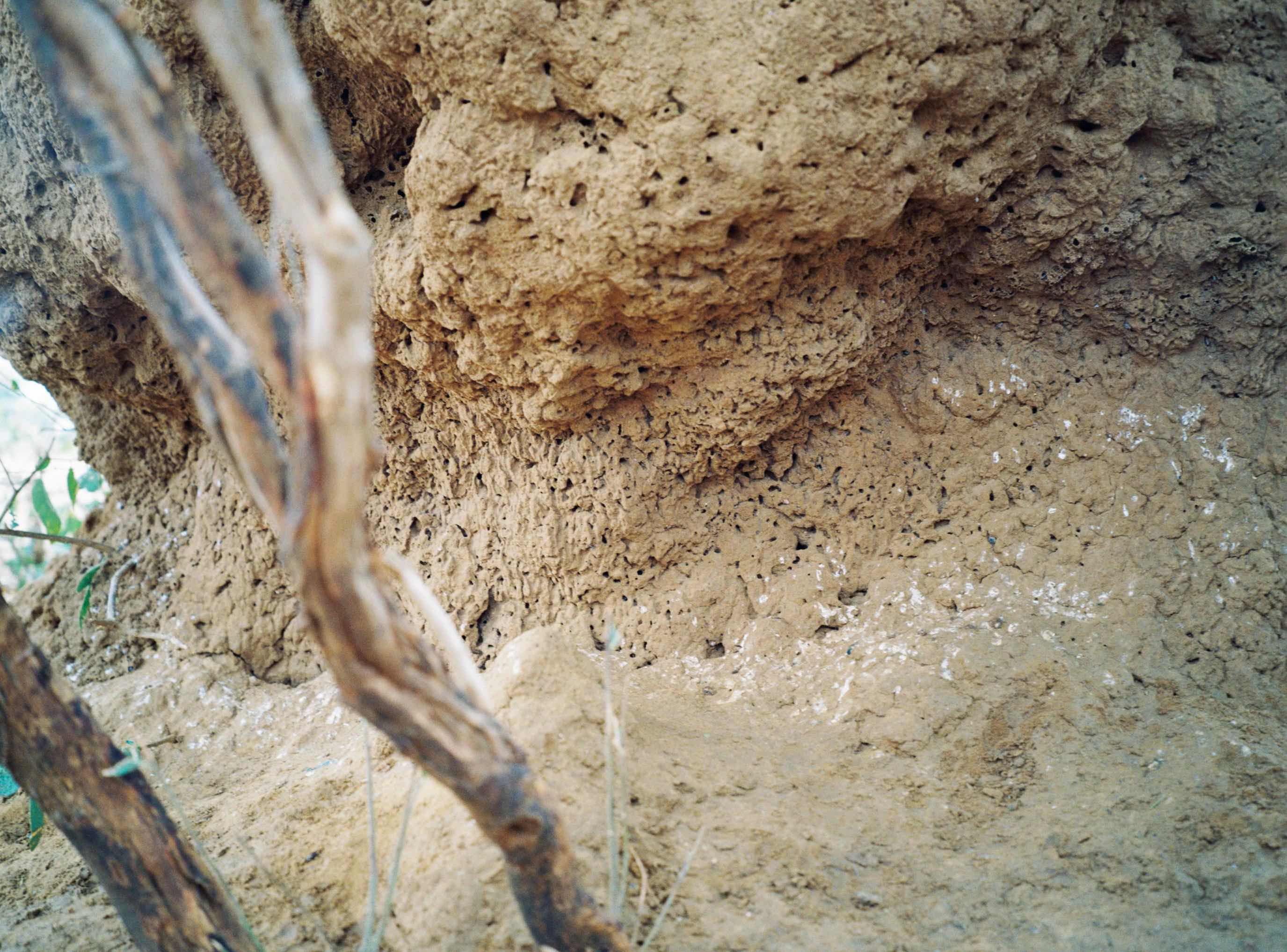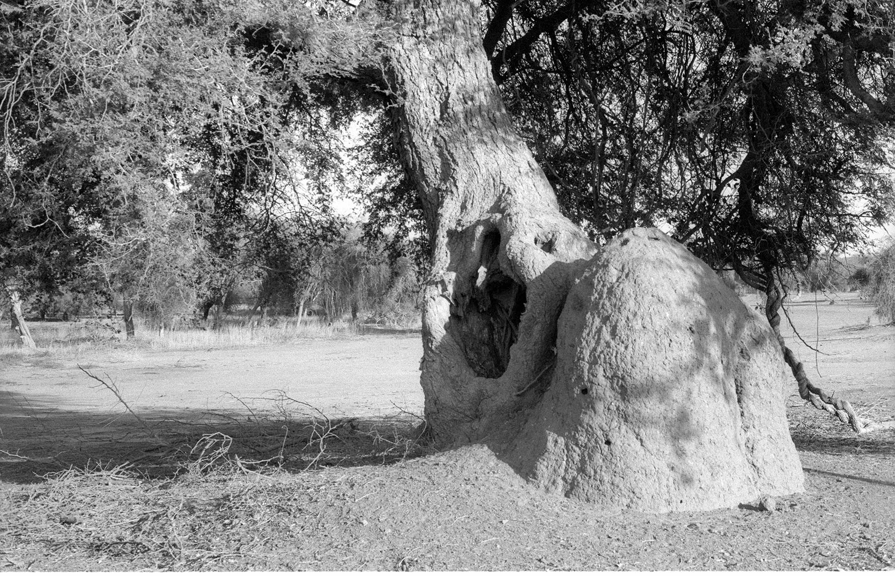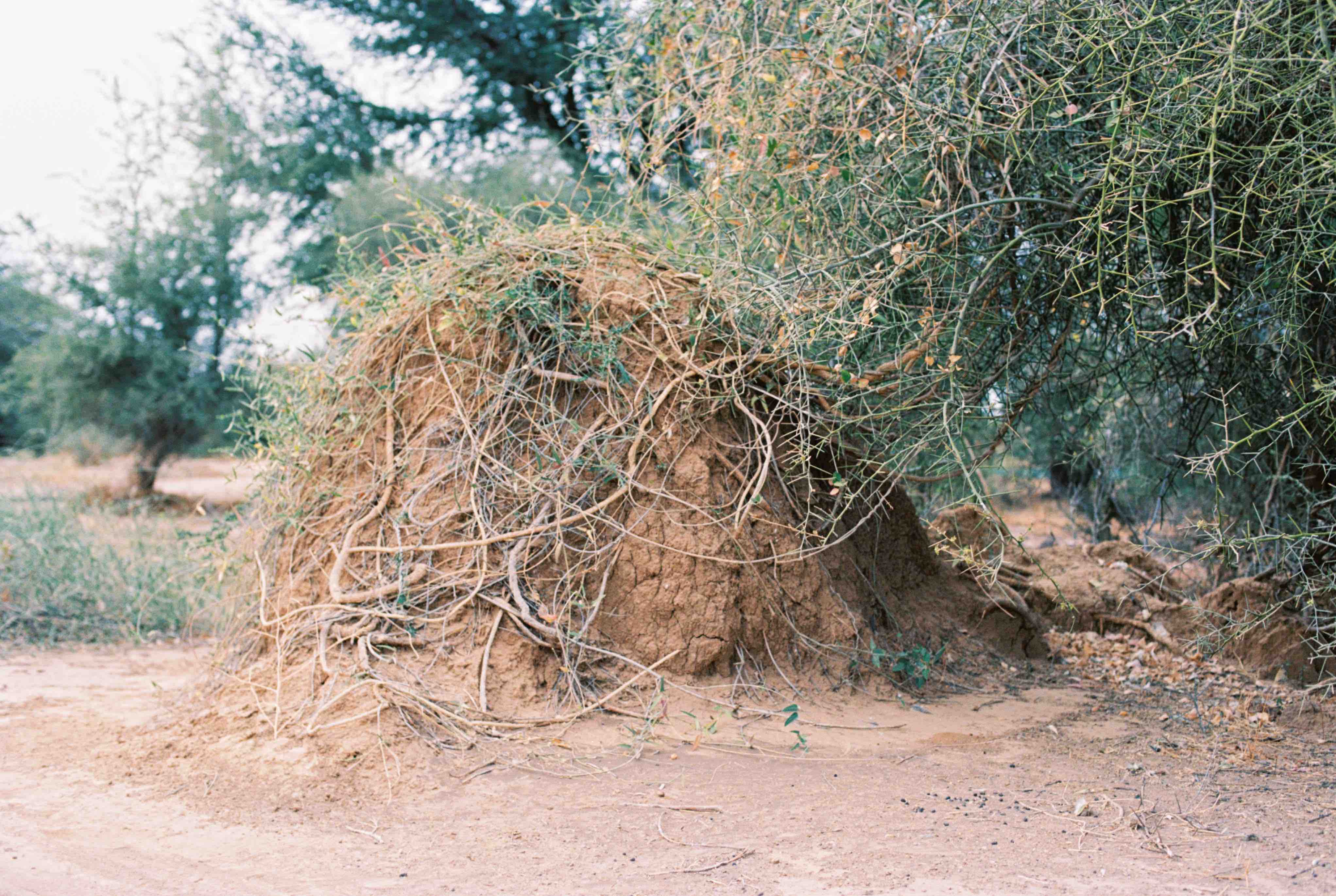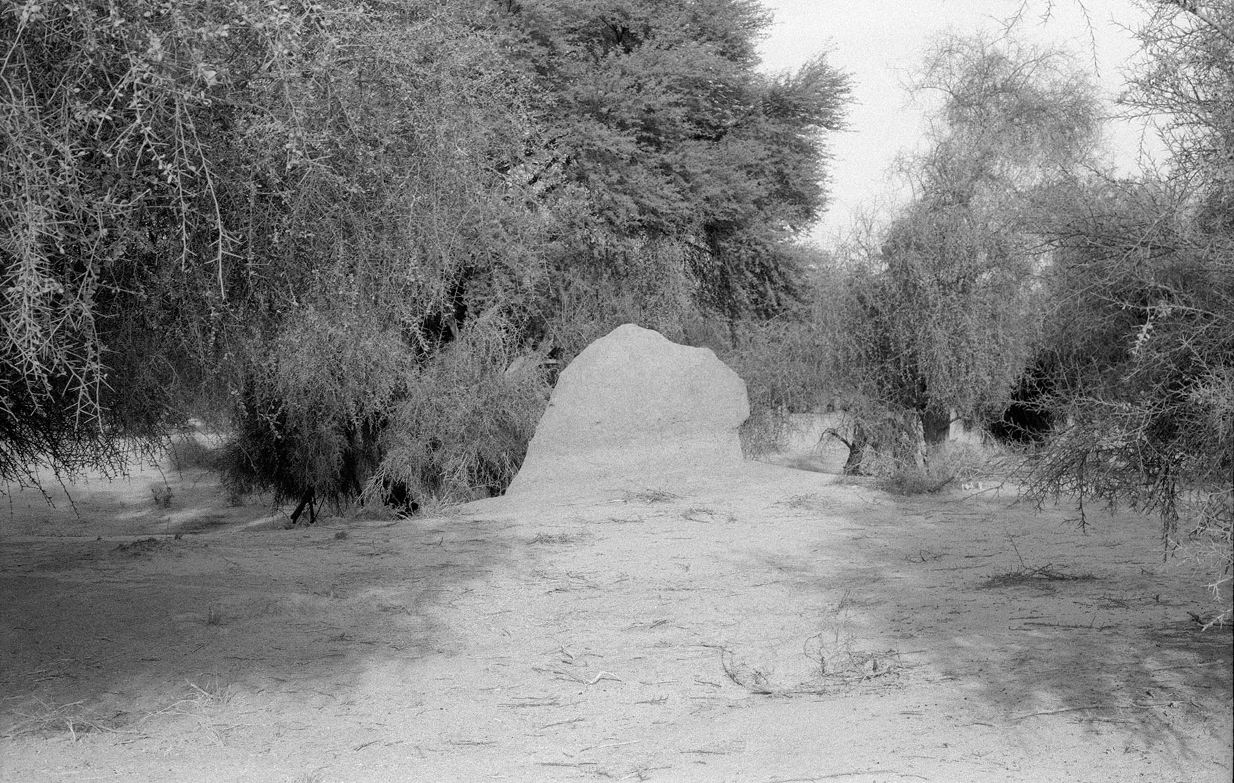 Since that first meeting, I have returned regularly to this particular mound and the surrounding area, taking photographs with an analogue camera. The process of analogue photography delays the moment of seeing the image. Once I see it, I am closer to the moment I took the picture, but also elsewhere, in another time. Analogue photography disrupts linear, temporal experience by making past moments visible. The photograph, as light etched on film, reconfigures presence and absence, duration and fugitivity. Brief moments spent in places can be represented by images – photographs – that crystallize those moments forever. Or, the long time we spend in places can be condensed into a single shot taken in fragments of a second. A still image is only a detail of what is felt, sensed and seen. It is inherently incomplete and fragmentary. The mounds are fixed, static formations that change over time, but these changes might not be visible to the camera, even over the course of weeks or months. This peculiarity of termite mounds, their apparent stability and internal dynamism, makes them generative, if perhaps counter-intuitive, subjects for photography.