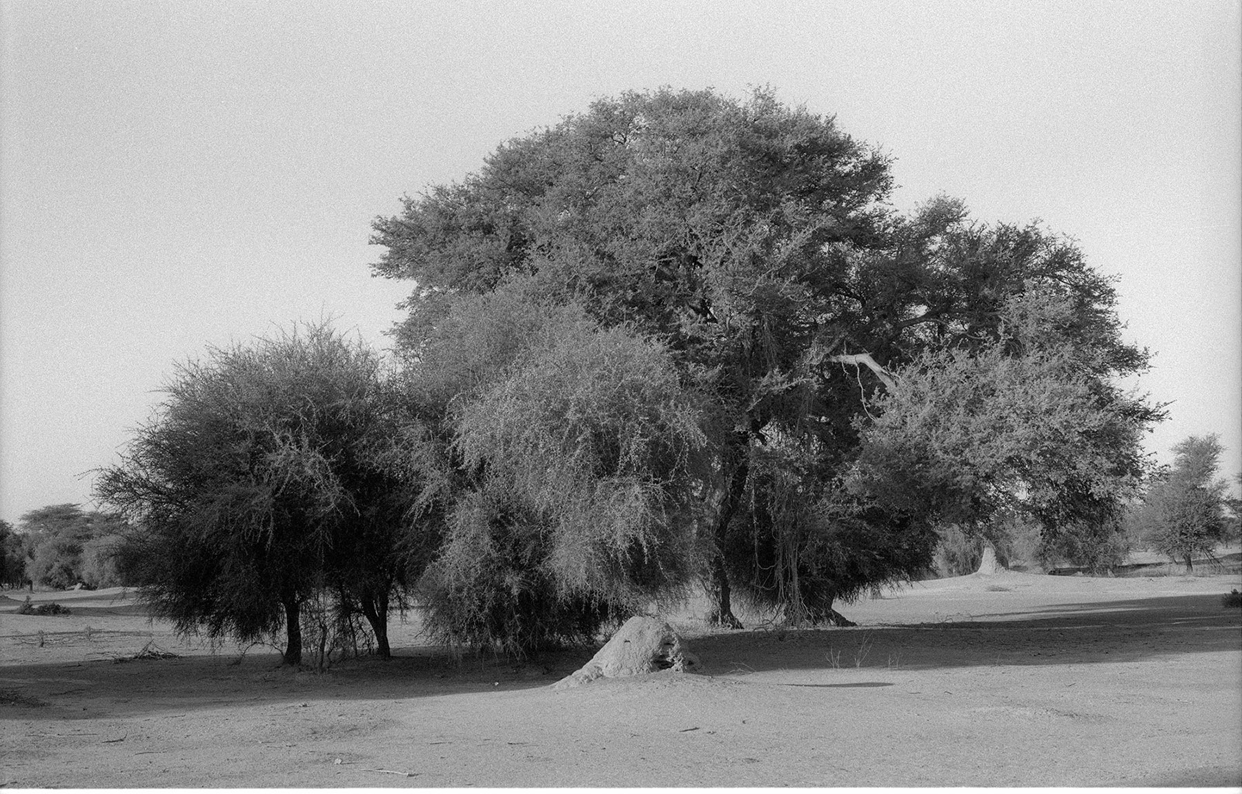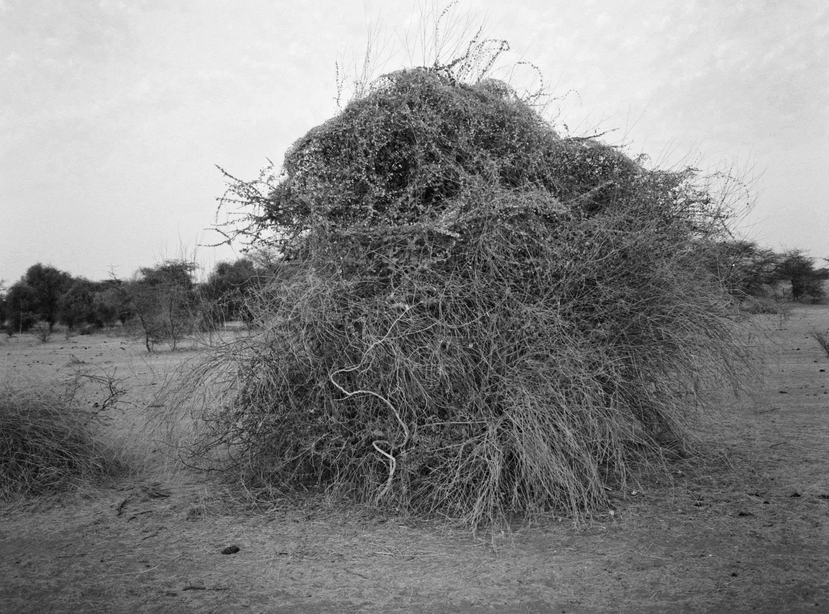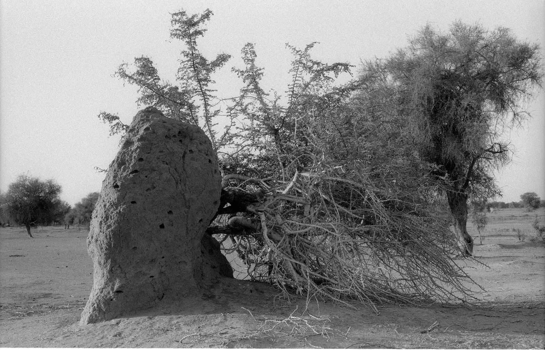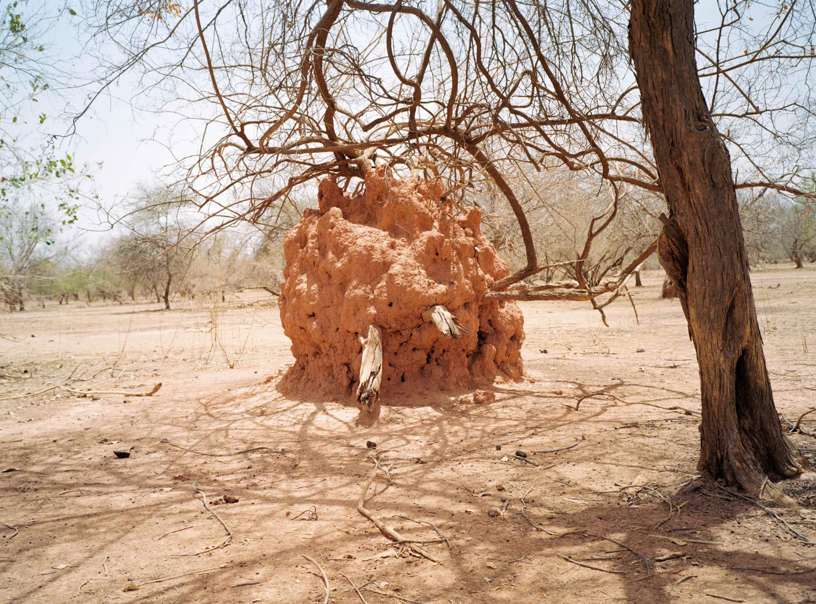 Since that first meeting, I have returned regularly to this particular mound and the surrounding area, taking photographs with an analogue camera. The process of analogue photography delays the moment of seeing the image. Once I see it, I am closer to the moment I took the picture, but also elsewhere, in another time. Analogue photography disrupts linear, temporal experience by making past moments visible. The photograph, as light etched on film, reconfigures presence and absence, duration and fugitivity. Brief moments spent in places can be represented by images – photographs – that crystallize those moments forever. Or, the long time we spend in places can be condensed into a single shot taken in fragments of a second. A still image is only a detail of what is felt, sensed and seen. It is inherently incomplete and fragmentary. The mounds are fixed, static formations that change over time, but these changes might not be visible to the camera, even over the course of weeks or months. This peculiarity of termite mounds, their apparent stability and internal dynamism, makes them generative, if perhaps counter-intuitive, subjects for photography.