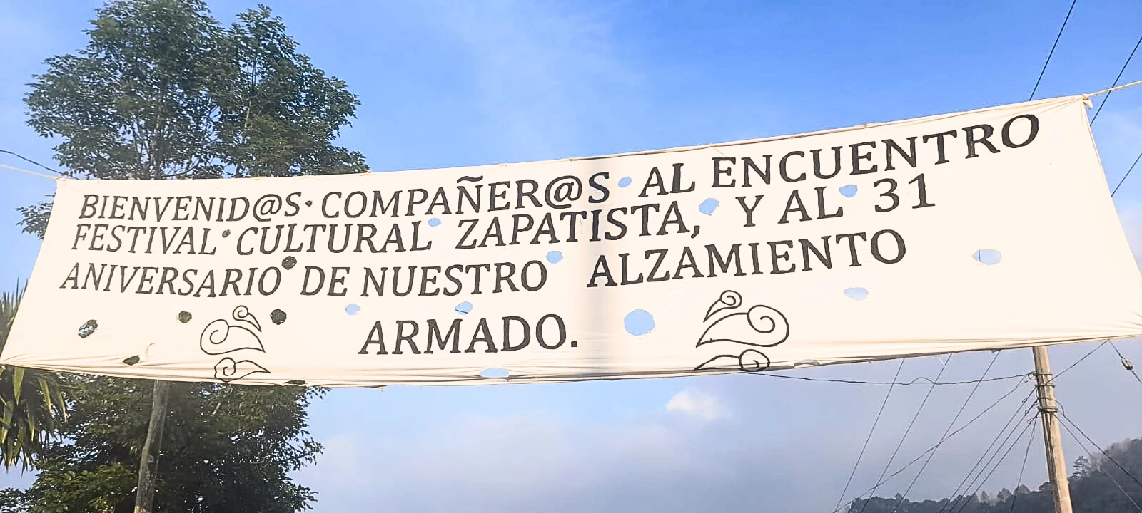 Banner, ‘Welcome to Caracol Oventik’. Photo Natalia Arcos Salvo, December 2024