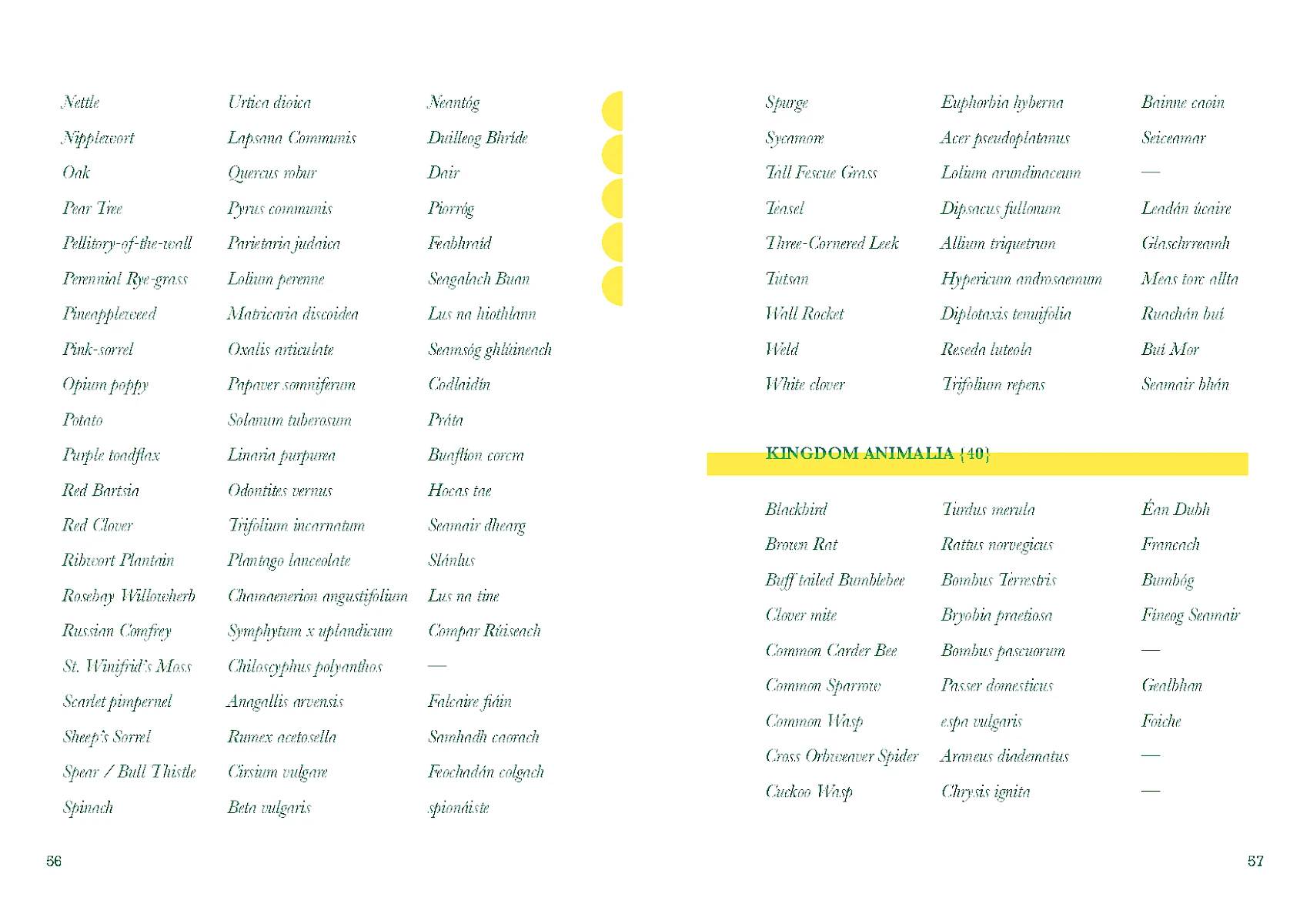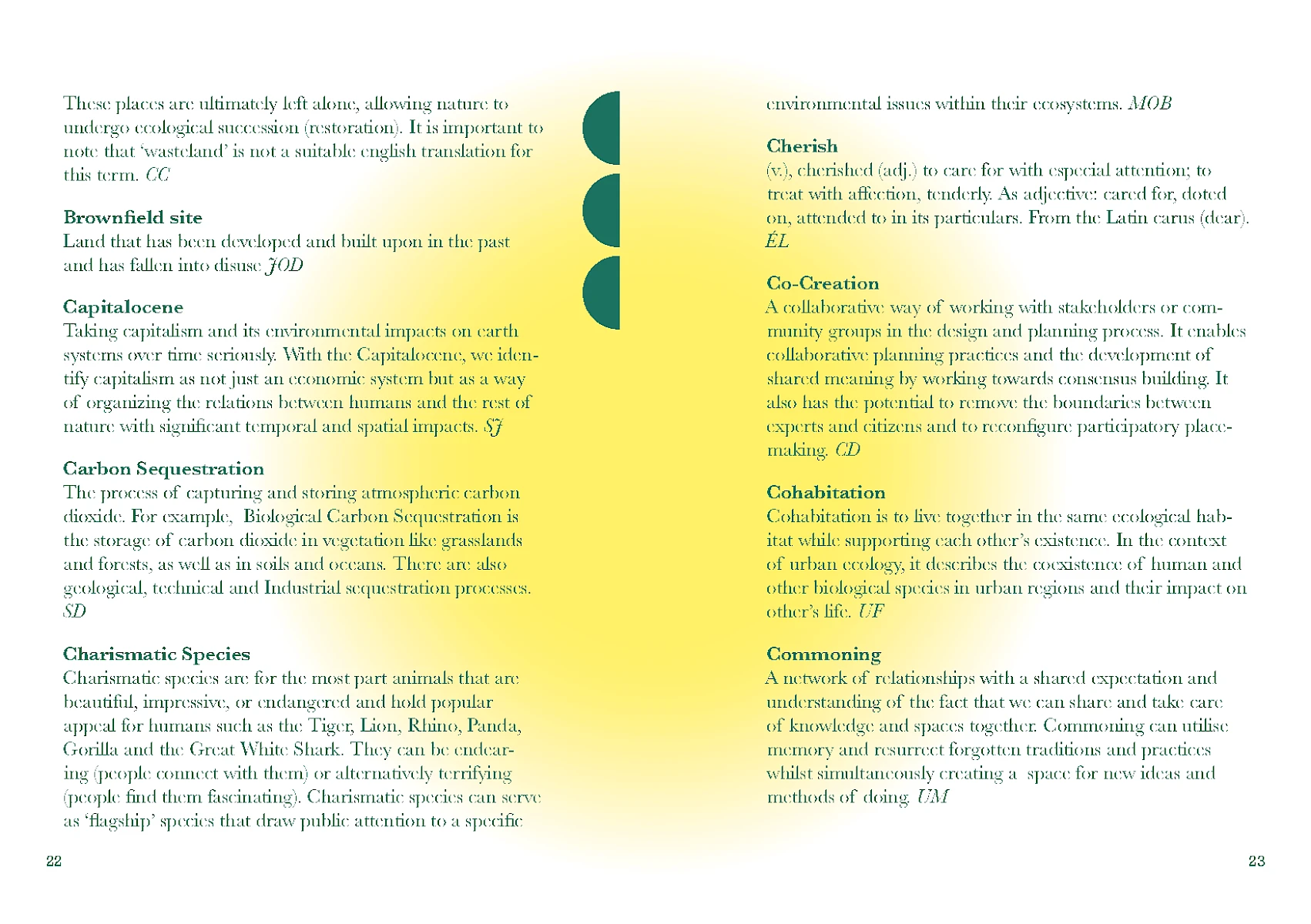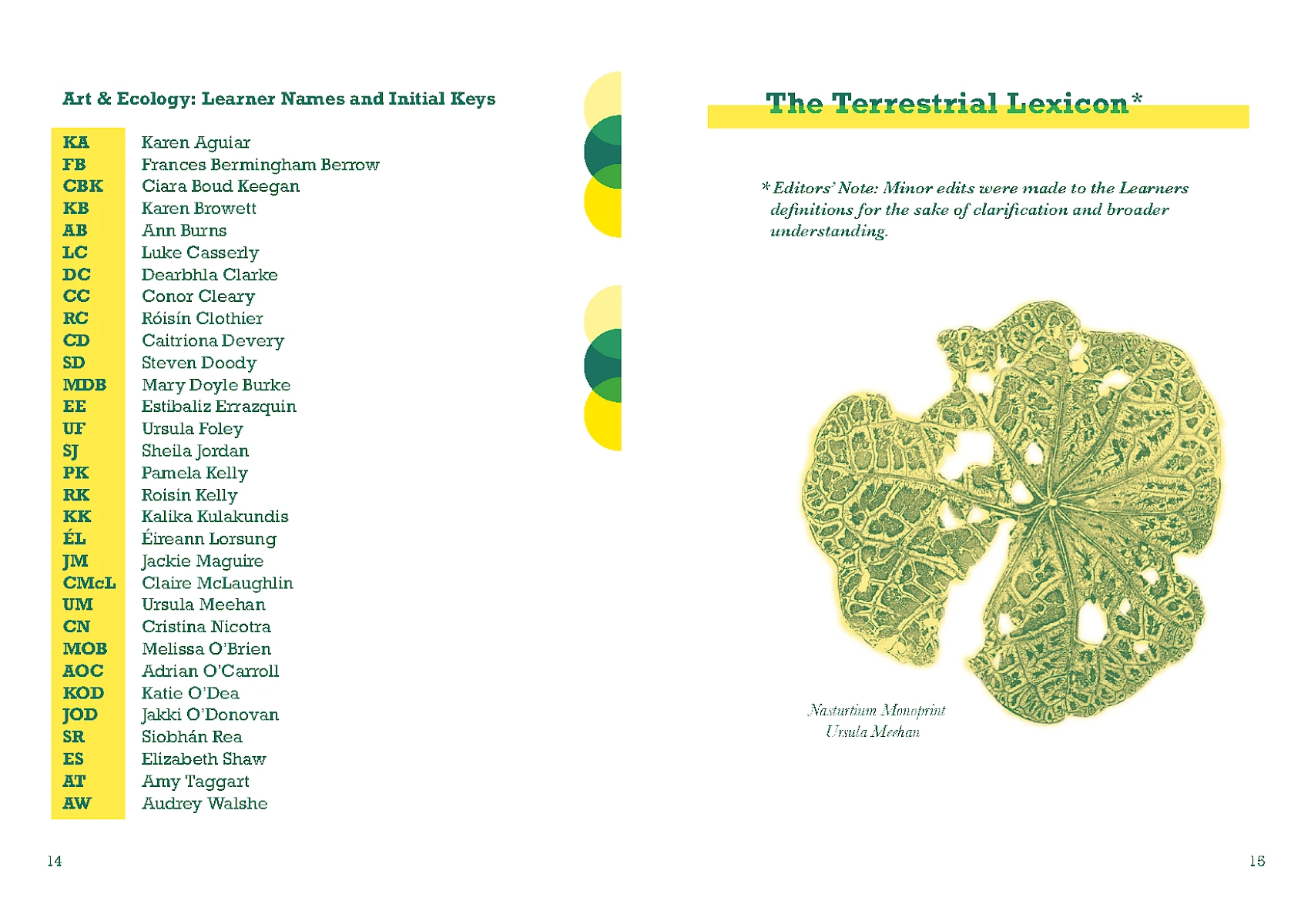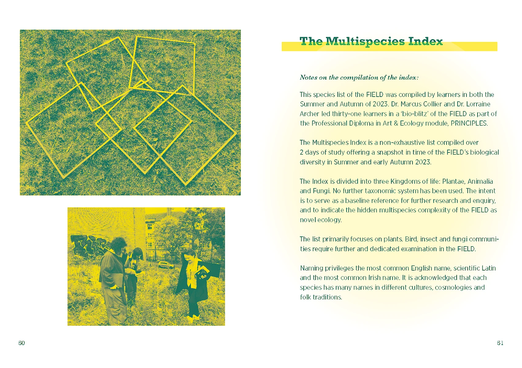 FIELD Guide – A Terrestrial Lexicon & Multispecies Index was compiled after the completion of the first cycle of the Creative Future Academy’s Professional Diploma in Art and Ecology course at the National College of Art and Design (NCAD) in Dublin. A heterogeneous coalition of learners met for a series of four seasonal intensives over the course of a year. They engaged with contemporary critical ecologies, and learnt (oft times unlearnt) how to work together and consider how we might ‘reworld’ our relationships with the environment and more- than-human worlds.
