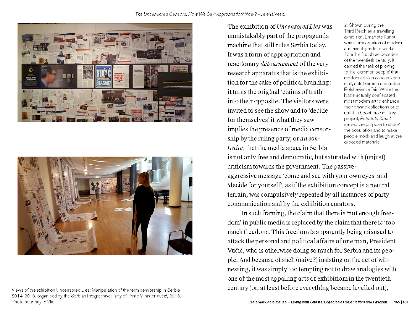 These shifts are palpable in the contemporary political uncertainties expressed in this collection of texts. Each of the contributors reflect on the specificities of their environment through their lived experiences, through their artistic practices, or reflections on the curatorial climate. They seek to maintain a space for critical engagement and political criticism. Furthermore, this issue considers the layers of historical conditions that inform states of 'belonging' and 'sovereignty' (even 'citizenry' as a debatable proposition) in Europe. What becomes evident from these various contributions is that there is no sudden or surprising development towards the right – too often expressed an 'inexplicable phenomena' of contemporary society. They instead address it as a slow and steady movement based on historical events and political terms of reference which have remain unresolved and have again returned, this time through the opportunism advanced and fuelled by the structures of capitalism that connect Europe to Russia and America. Each is a case study that recognises the patterns of violence and inequality evident in the political structures of colonialism and fascism.
