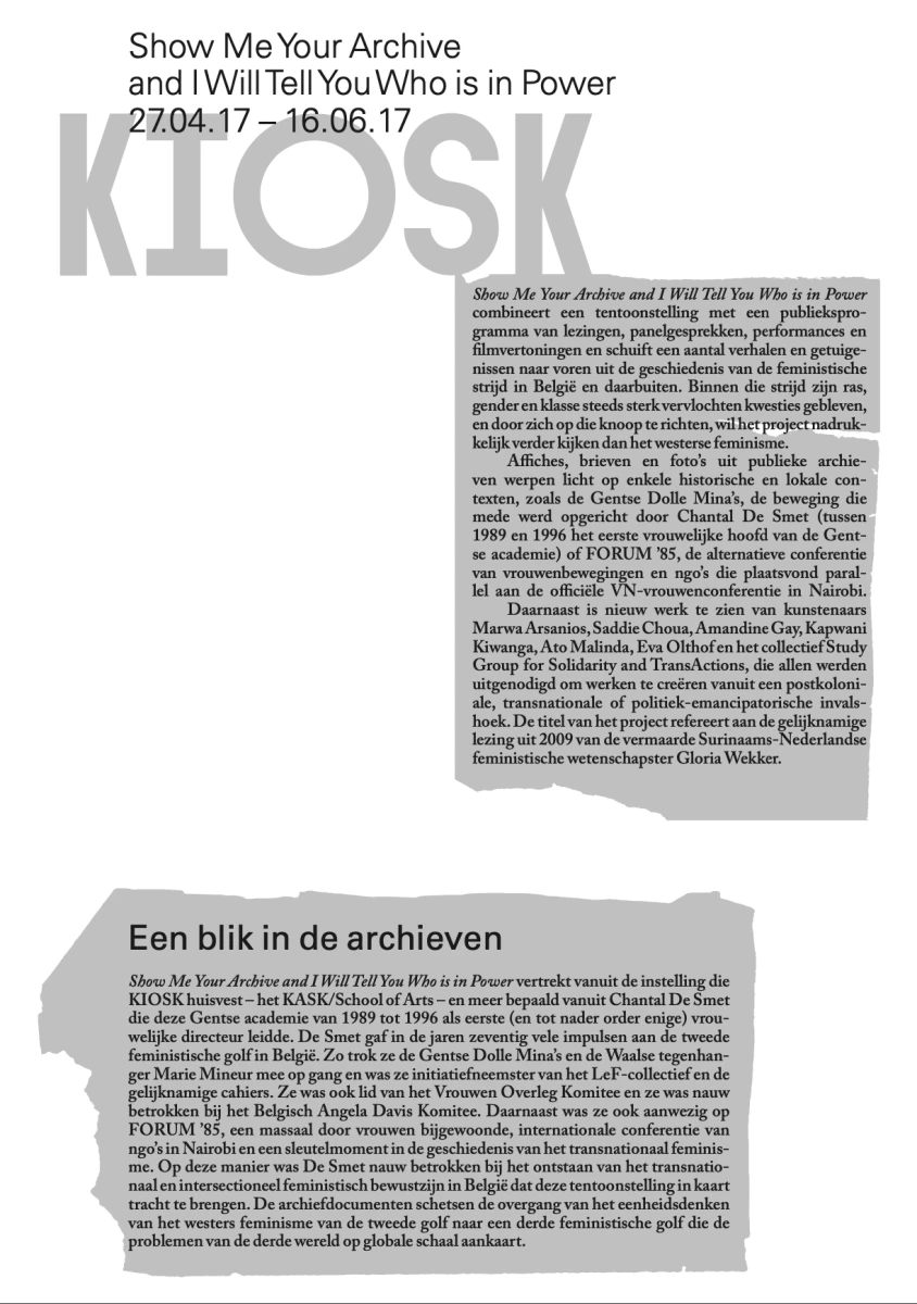Show Me Your Archive and I Will Tell You Who is in Power combines an exhibition with a public program of lectures, panel discussions, performances and screenings to present stories and testimonies from the history of feminist struggle in Belgium and beyond. Within that struggle,the categories of race, gender and class continue to be thoroughly intertwined, and by focusing on these intersections the project wishes to extend its scope beyond Western feminism.