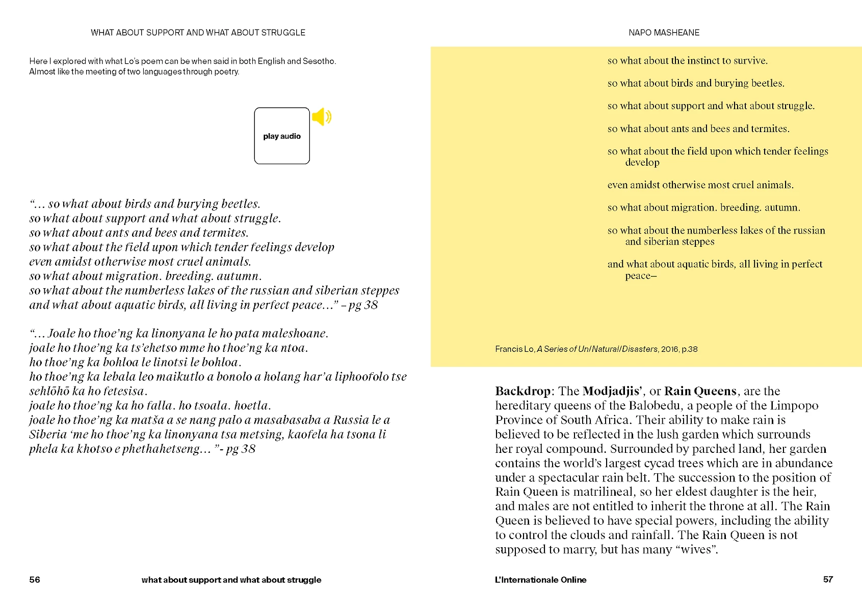 what about support and what about struggle is edited by L'Internationale Online and Jennifer Hayashida, as a collection of poetic responses on the most essential topic of today: how to survive un/natural catastrophes?
